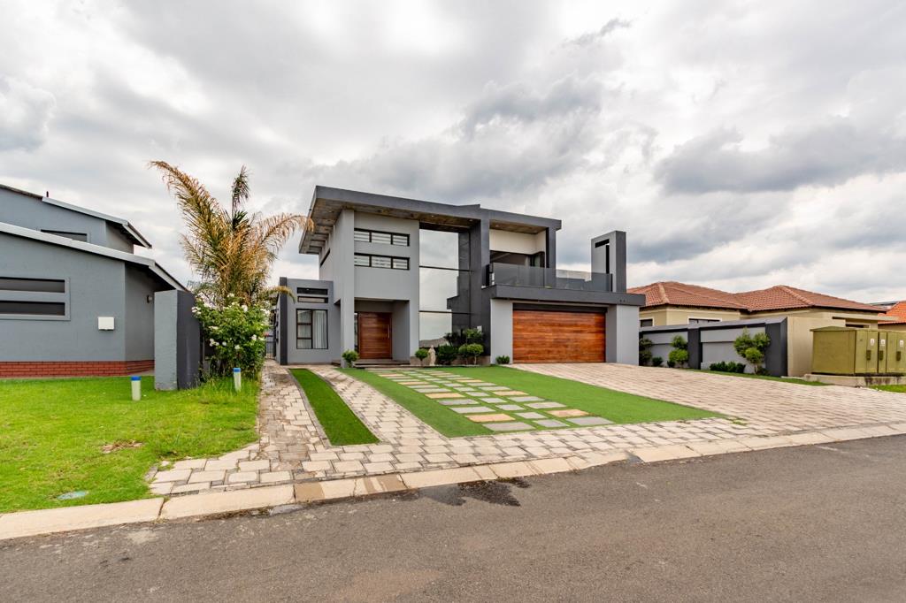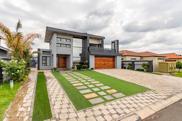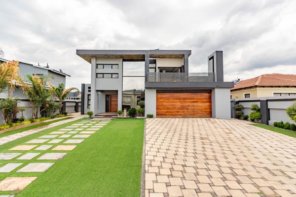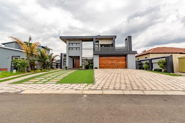 Discover an unparalleled lifestyle within this exquisite modern residence, perfectly situated in the prestigious Helderwyk security estate in Brakpan. This architectural masterpiece, spanning an impressive 489 sqm on a 713 sqm erf, immediately captivates with its sleek grey and warm wooden facade, expansive glass elements, and a meticulously landscaped driveway featuring artificial turf and elegant paving. The double garage and additional parking ensure ample space for discerning residents and guests.