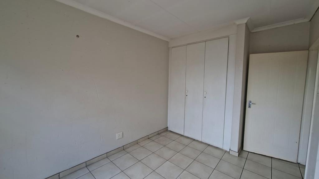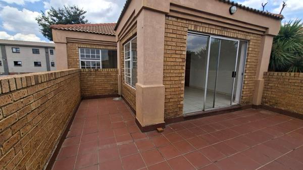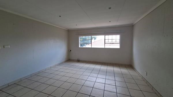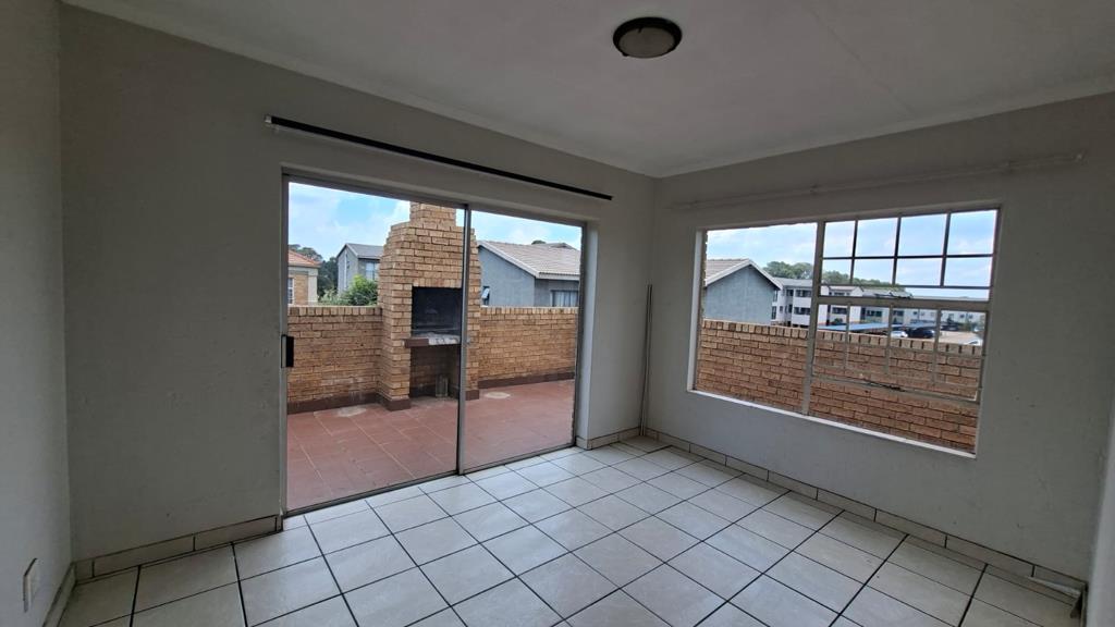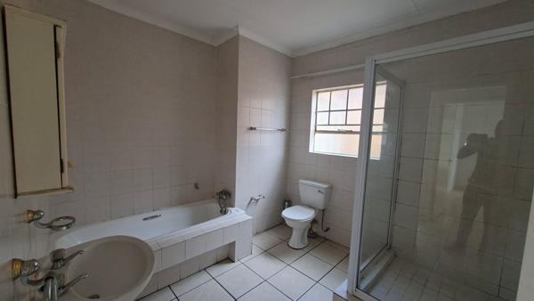 A spacious dining room with sliding doors to a patio with a built in braai. The full bathroom has both a bath and a shower.