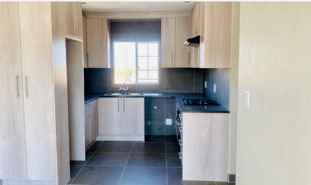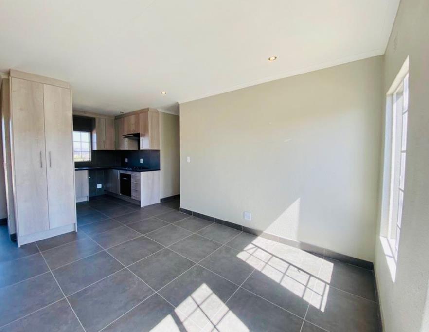 Discover modern living in this inviting 2-bedroom, 1-bathroom apartment, ideally situated within the secure Eden Terrace complex in Eden Glen, Edenvale. This contemporary unit features an open-plan layout, seamlessly connecting the lounge and family TV room to a well-appointed kitchen. The kitchen boasts sleek light wood-look cabinetry, dark countertops, a built-in hob, and ample storage, including a tall pantry-style cupboard, all complemented by durable dark tiled flooring. Natural light floods the living spaces, enhanced by recessed ceiling lights.