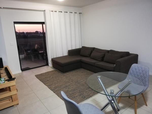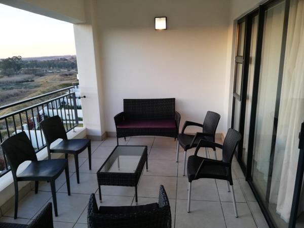 The apartment offers a bright open-plan living area with contemporary finishes, flowing seamlessly onto a private balcony with scenic views perfect for relaxing after a long day. The modern kitchen is fully equipped with quality appliances, including a gas hob, oven, microwave, dishwasher, refrigerator, and washing machines, plus a convenient integrated dining space.