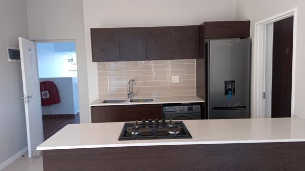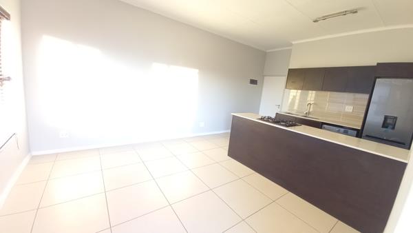 Open-plan kitchen and lounge with gas hob, electric oven, washerdrier combo machine