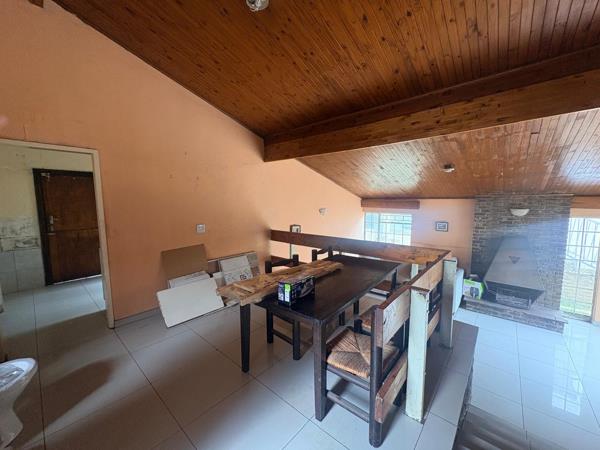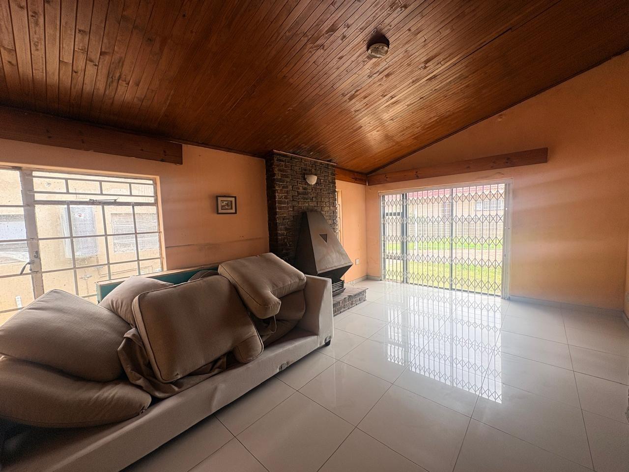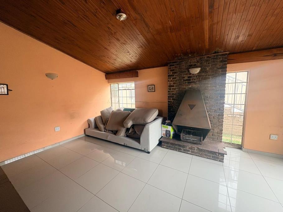 The home features a bright lounge with vaulted wooden ceilings, tiled flooring, and a character-filled fireplace that creates a warm focal point. Large windows and a sliding door allow for excellent natural light, enhancing the open feel of the living area. A functional kitchen and generously sized bedrooms with built-in storage in select rooms complete the practical layout.