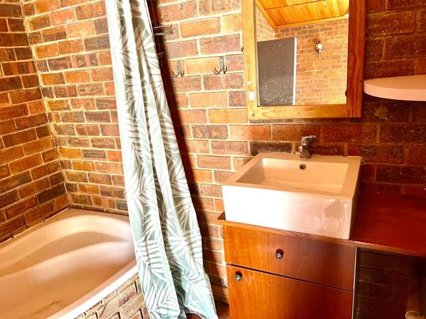 A stylish open dresser adorns the bedroom, and the rustic bathroom is equipped with a shower and bathtub.