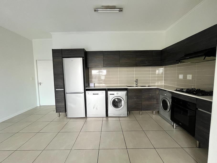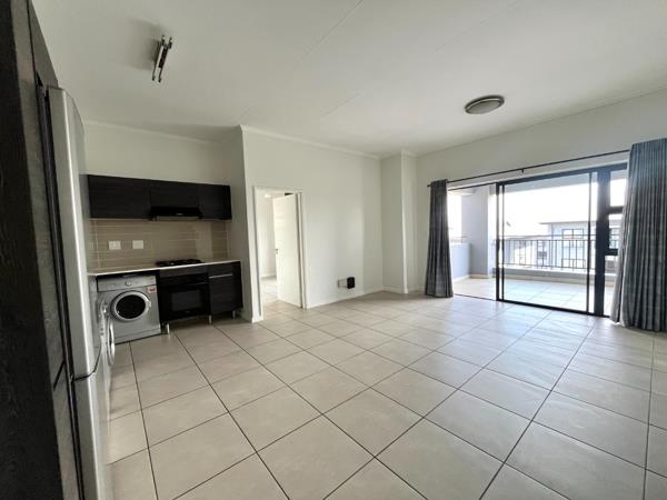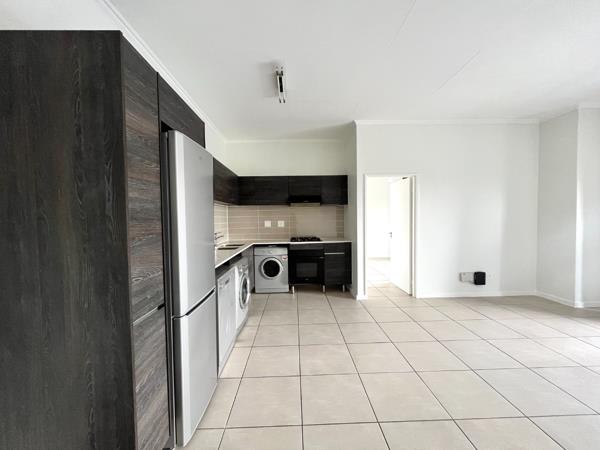 This contemporary 1-bedroom, 1-bathroom apartment in Modderfontein offers a sophisticated living experience. The open-plan design seamlessly connects the lounge, dining area, and a modern kitchen, creating a spacious and inviting atmosphere. The kitchen is a highlight, featuring sleek dark wood-look cabinetry, light countertops, and integrated stainless steel appliances including an oven, gas hob, extractor fan, fridge, and a washing machine. Tiled flooring throughout ensures easy maintenance, complemented by fresh white walls that provide a neutral canvas for personal styling. Large windows and sliding doors flood the space with natural light.