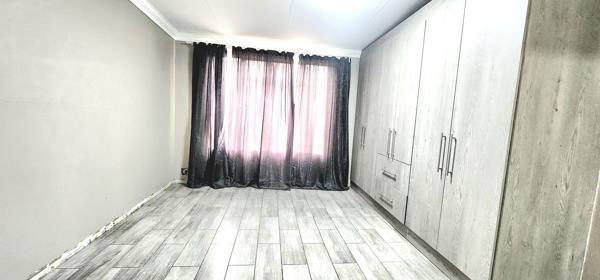 This meticulously appointed 1-bedroom, 1-bathroom residence in Dinwiddie, Germiston, offers a contemporary living experience. The interior features modern wood-look tiled flooring, neutral grey walls, and elegant crown molding, creating a sophisticated aesthetic. The layout comprises a comfortable lounge and dining area, flowing into a modern kitchen equipped with pristine white base cabinetry, dark countertops, a double stainless steel sink, and a tall storage cupboard, all benefiting from natural light.