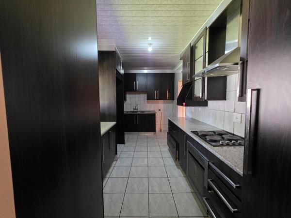The home features a welcoming lounge and dining area, ideal for everyday living and entertaining. The galley-style kitchen is fitted with beautiful dark wood cupboards and offers plenty of storage space, flowing out to a covered patioperfect for relaxed braais and outdoor gatherings.