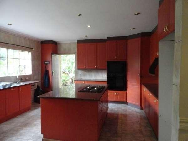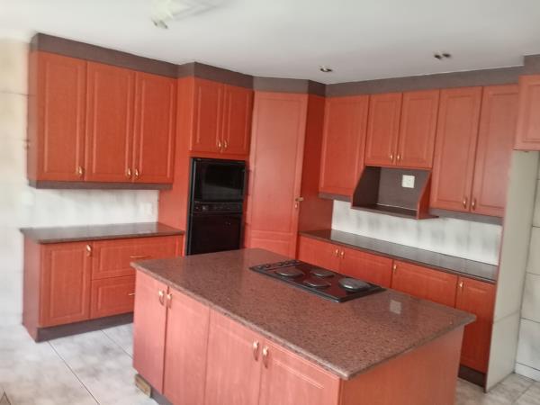 Modern Kitchen with cherry wood units. Loads of cupboards and working surfaces with Island nook and open plan with family room and dining room which opens out onto entertaining patio overlooking garden and pool. Walk in cupboard for household storage.