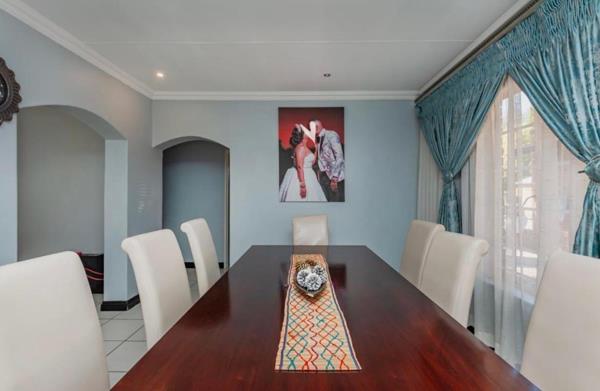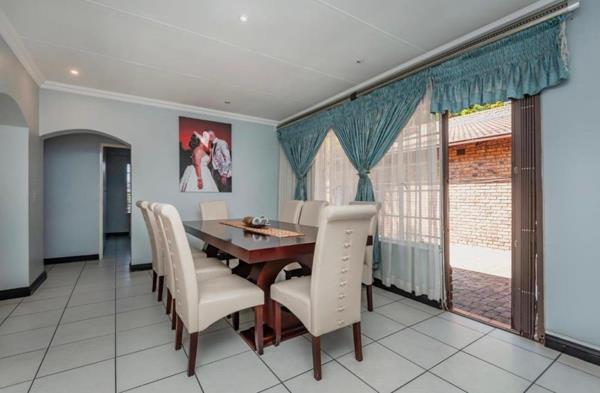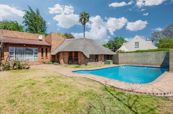 Designed for an elevated lifestyle, this home is perfectly suited for families or professionals seeking a blend of comfort and entertainment. The expansive outdoor area features a large swimming pool, ideal for leisure and recreation. A distinctive thatched lapa, complete with a built-in jacuzzi and a bar, creates an inviting space for hosting guests or enjoying private moments. The property further benefits from a dedicated braai room and a generous garden adorned with mature palm trees, offering a serene environment. Pets are permitted, making this an ideal home for animal lovers.