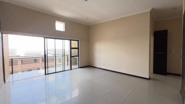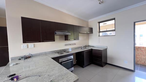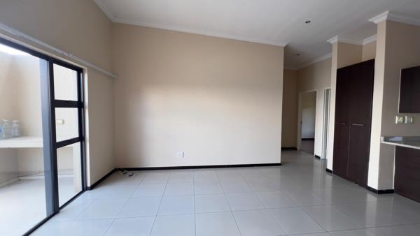 Step into a sleek, open-plan kitchen with granite countertops, modern dark cabinetry, a built-in oven, and space for appliances. The spacious lounge flows seamlessly from the kitchen, ideal for relaxing or entertaining guests.