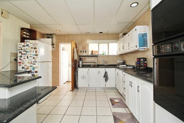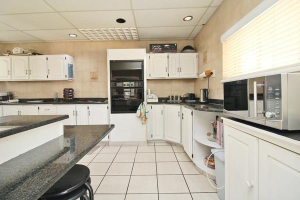 The modern, spacious kitchen is fitted with granite countertops, a breakfast nook, and a separate scullery, providing both style and practicality.