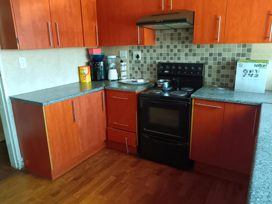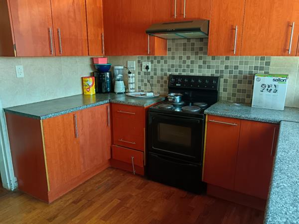 The functional kitchen is equipped with ample warm-toned cabinetry, dark countertops, and a tiled backsplash, providing generous storage and preparation space. It features a freestanding stove with an overhead range hood, catering to everyday culinary needs. The property''s exterior boasts a well-maintained front garden with new plantings, a paved pathway, and a tiled roof, contributing to its neat kerb appeal.