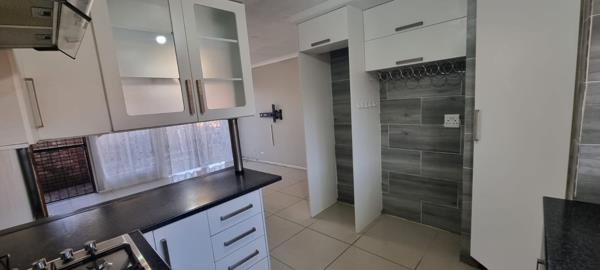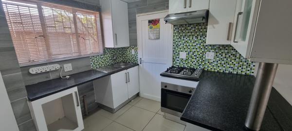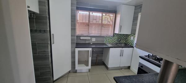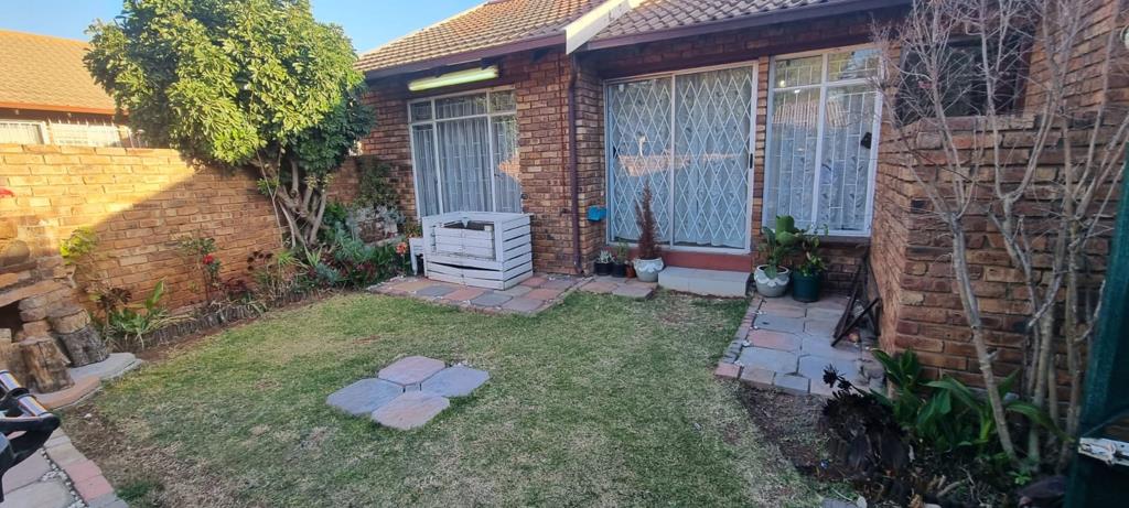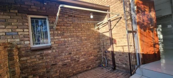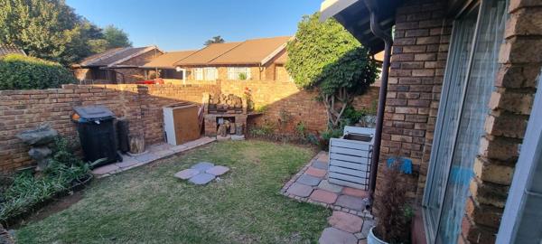 Fully tiled klinker townhouse with large open plan lounge with sliding door to the garden. Open plan kitchen with breakfast counter, gas hob with electrical under counter oven, extractor fan and dishwasher / washing machine connection and built-in cupboards. 2 Bedrooms (with built-in cupboards) and 1 bathroom with bath and shower over bath. Single garage with roll-up door and single carport. Private front garden with built-in braai and small paved courtyard with washing line.