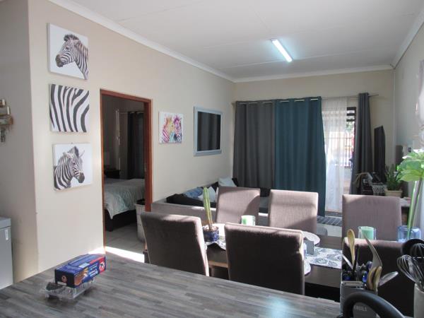 An open plan Lounge, Dining and Kitchen area with tile finishes.