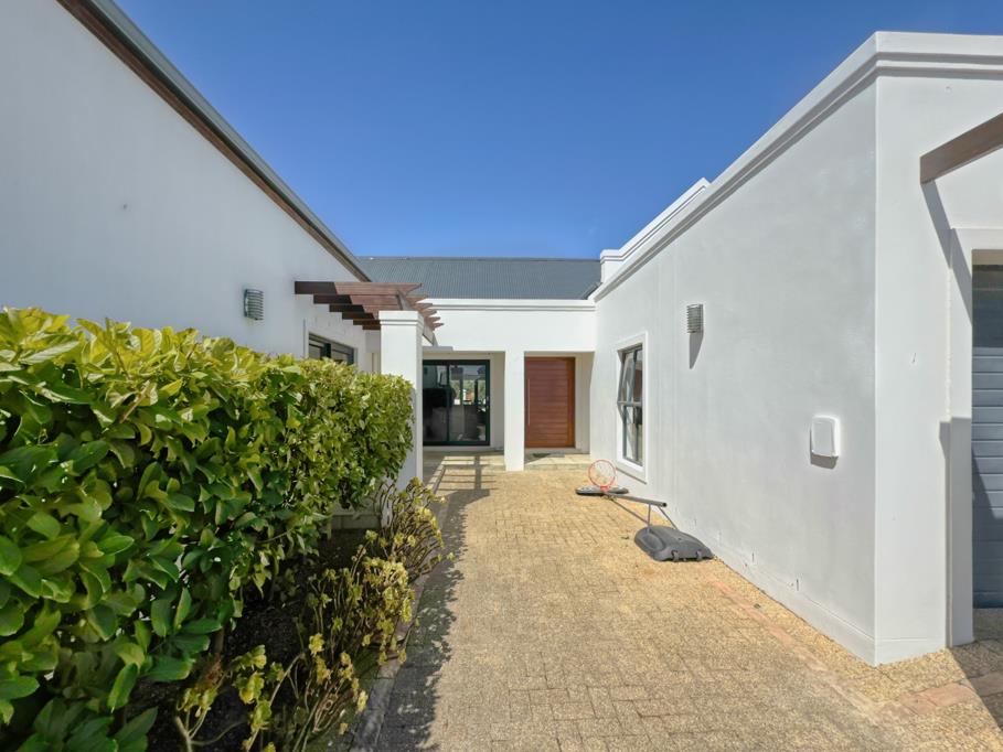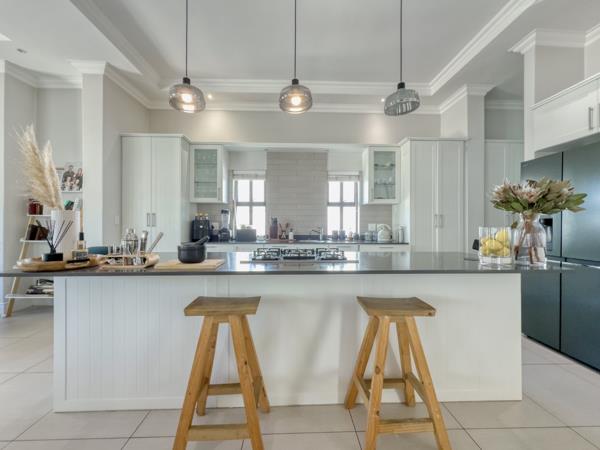 Discover modern living in this exquisite 3-bedroom, 3-bathroom residence nestled within the prestigious Croydon Olive Estate in Somerset West. This property boasts a contemporary architectural style with clean white walls and distinctive gabled roofs, presenting excellent kerb appeal. The well-maintained exterior features neat landscaping and a paved driveway leading to a double garage, ensuring ample parking and convenience.