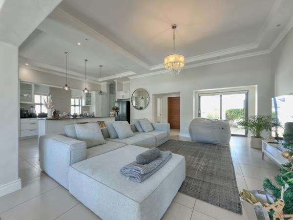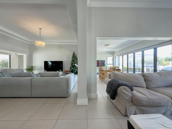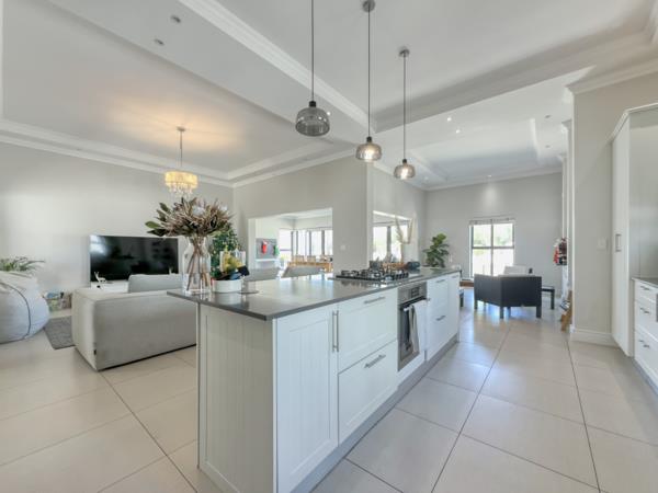 Step inside to an expansive open-plan layout, seamlessly connecting the living, dining, and kitchen areas. The heart of the home is a modern kitchen, equipped with a large island, gas hob, built-in oven, and sleek white cabinetry complemented by dark countertops. High ceilings with elegant crown molding, recessed lighting, and durable tiled flooring enhance the bright and airy ambiance throughout. The home further offers two comfortable lounges, a dedicated dining area, a family TV room, a guest toilet, and a practical laundry room.