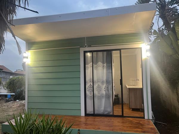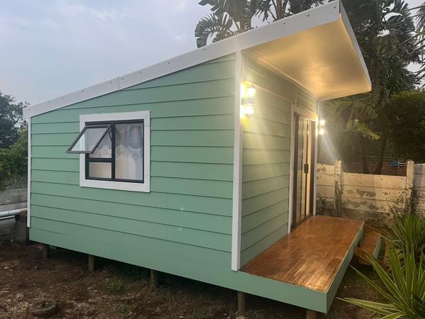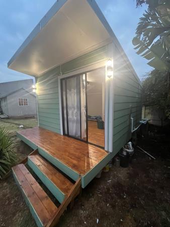 The bathroom features a tiled shower cubicle fitted inside the unit for privacy and convenience. The kitchenette includes a fitted sink with under-counter storage and a gas stove. The unit has quality wooden flooring throughout, aluminium sliding door and windows, and modern downlights. A private wooden deck with steps, sage green cladding, and a secure yard setting complete the offering.