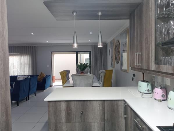 The open-plan living and dining area flows effortlessly to a covered patio with built-in braai, ideal for entertaining. The modern kitchen is fitted with a gas stove, scullery, and inverter system, ensuring convenience during load-shedding.