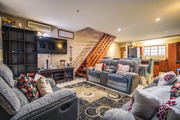 The versatile layout is ideal for families, those requiring work-from-home flexibility, or dual living options. Downstairs, an inviting open-plan lounge, dining area, and a modern kitchen create a seamless living space. The kitchen is well-appointed with built-in cupboards and a gas stove, catering to contemporary needs. The property boasts two distinct lounge areas, including a spacious second lounge or TV room located upstairs, providing ample room for relaxation and entertainment. Sliding doors enhance the open-plan feel and connect indoor and outdoor living.