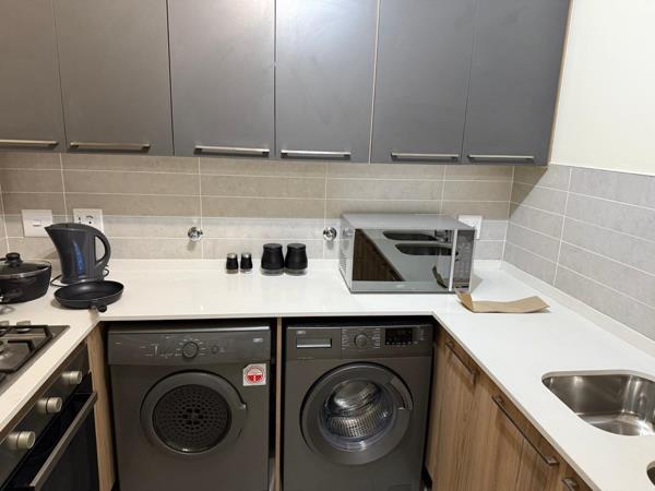 Kitchen with ample build in cupboards, three appliances and a gas stove.