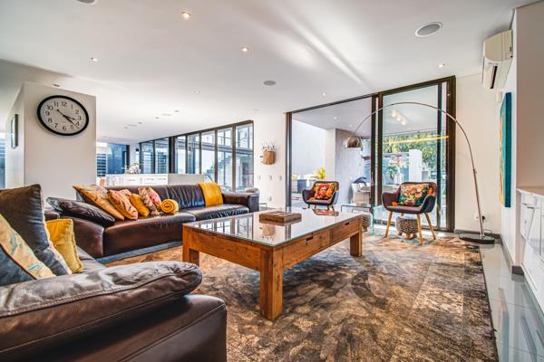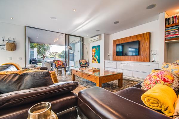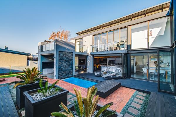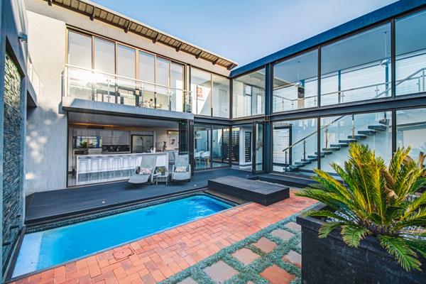 The kitchen extends into a warm and stylish TV lounge complete with a built-in bar. Wrap-around stacker doors open fully, creating a wonderful indoor-outdoor lifestyle ideal for summer gatherings. Outside, a generous entertainment area awaits, featuring a grand wood-fire built-in braai, a tranquil decking area, and a sparkling swimming poolthe perfect retreat for long sunny days.