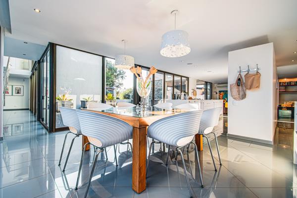 To the right of the entrance, an inviting open-plan dining area flows seamlessly into a modern kitchen centered around an impressive island, perfect for family breakfasts or effortless entertaining. A cleverly designed semi-dividing wall behind the kitchen leads to a walk-in pantry and scullery, accessible from both sides through a neat passageway. Beyond this space, you will find the domestic quarters, thoughtfully positioned away from the main home for added privacy.