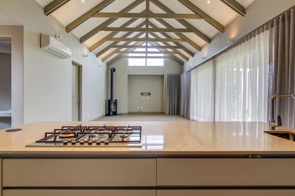Additional features include a built-in wood braai for outdoor gatherings, a double garage with a motorized door, and a fibre installation ready for activation. Enjoy the benefits of a pre-paid electricity system insuring your home remains functional and efficient.