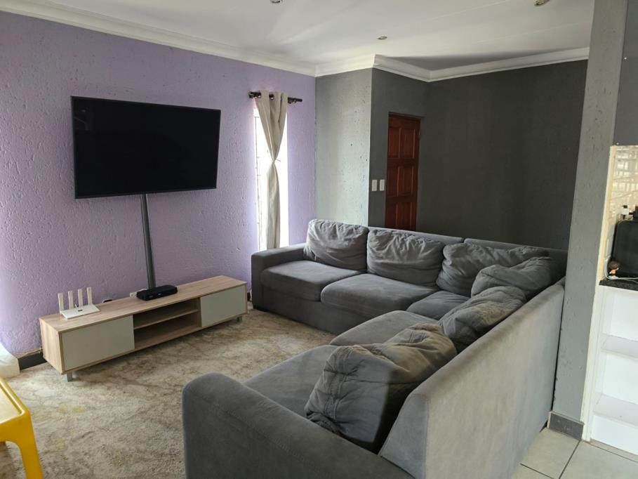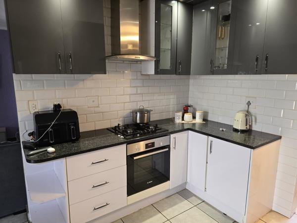 This contemporary three-bedroom, two-bathroom residence, including one en-suite, offers a sophisticated living experience within a secure estate in Terenure, Kempton Park. Spanning 185.00 sqm, the property features an intelligently designed open-plan layout, seamlessly integrating the modern kitchen, dining area, and lounge. The kitchen is appointed with sleek grey cabinetry, dark countertops, a white subway tile backsplash, and integrated appliances including an oven and gas hob, complemented by a dedicated laundry nook.
