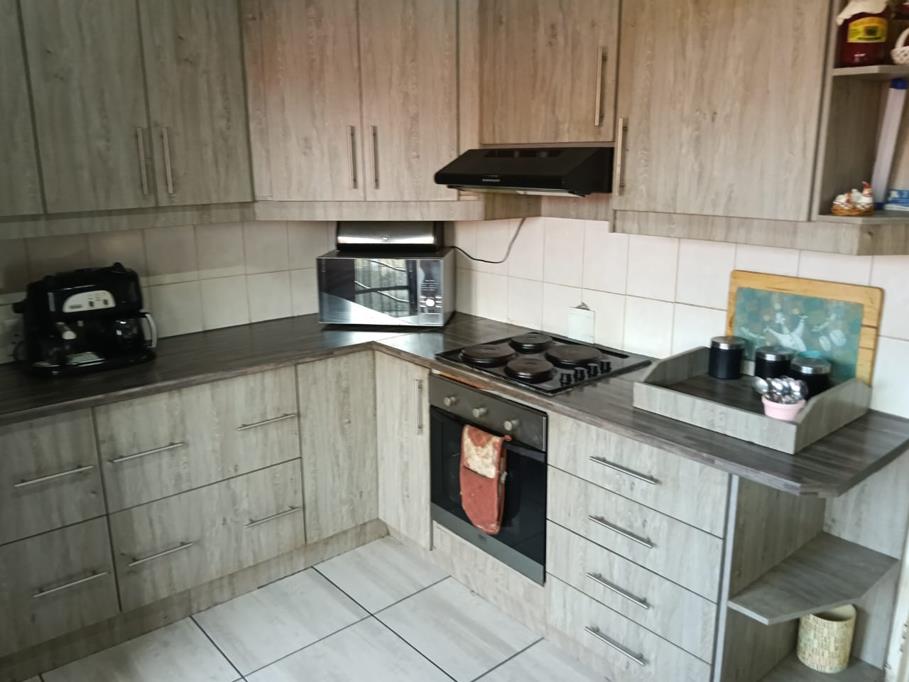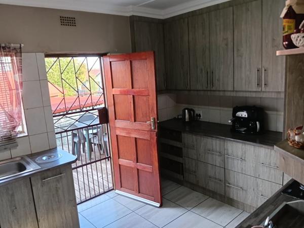 This warm and inviting family home is set in a very quiet street. The tiled open plan living area has a lounge and dining area right next to the kitchen and also extends out to the covered stoep, with stacking doors, perfect for entertainment and sunset braais. The beautiful melamine kitchen was recently renovated with an undercounter stove, extractor, double basin and space for 1 appliance. All three bedrooms are carpeted and have built-in cupboards. The bathroom has a bath and separate toilet. There is a spacious linen cupboard in the passage. All windows are steel with curtain rail. Outside the kitchen is a lovely wooden deck for pleasant breakfasts, which also offers storage room for odds and ends underneath. The garden is spacious and neat, requiring minimal water and attention. There is a single garage and safe parking. The property is fully walled and safe with burglar bars. There is pre-paid electricity.