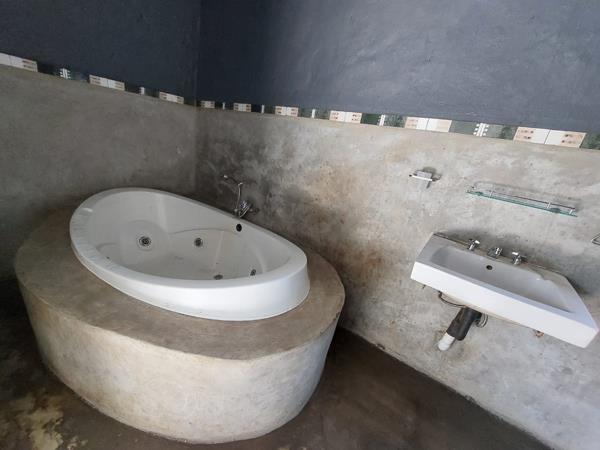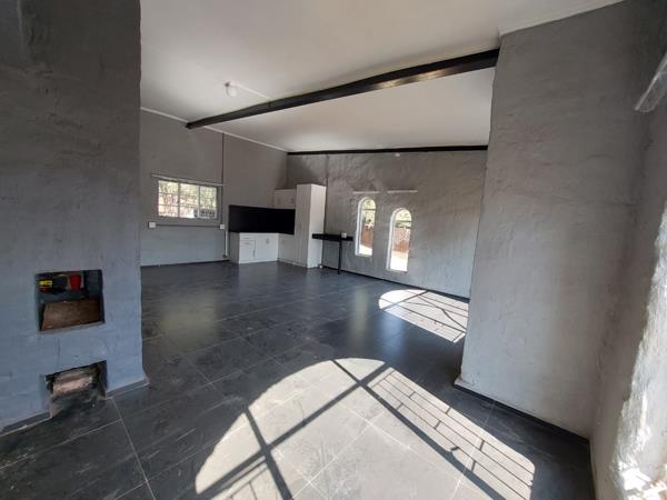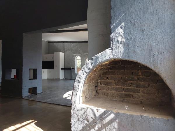 - Dining: Concrete flooring, rustic built-in braai, high ceilings, and contrast beams.