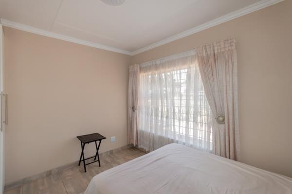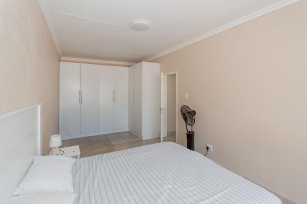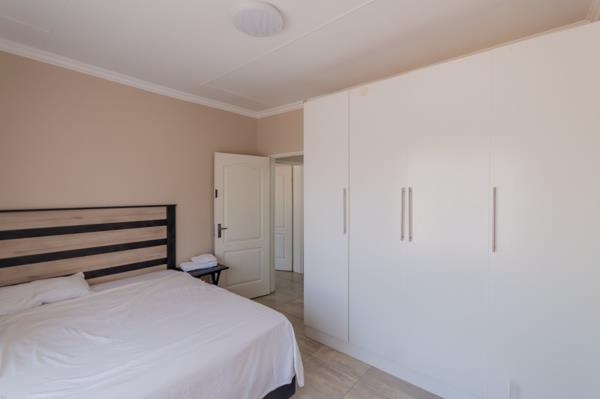 The unit features two well-sized bedrooms, both able to accommodate queen-size beds. The bathroom is modern and stylish, offering a double shower with no bathtub.