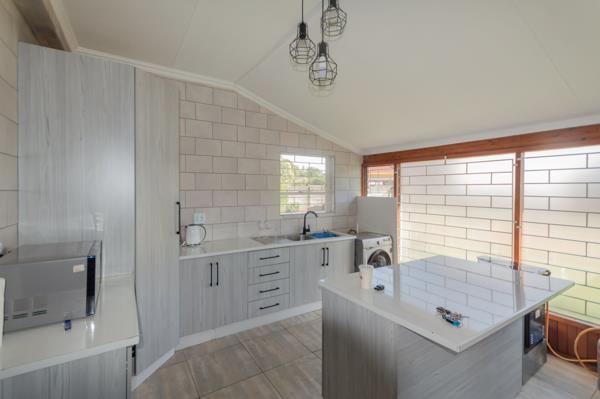 This very modern unit offers a spacious, well-designed kitchen fitted with a gas stove and space for a double-door fridge. The open and comfortable layout includes a lounge area with a TV port, ideal for relaxed living.