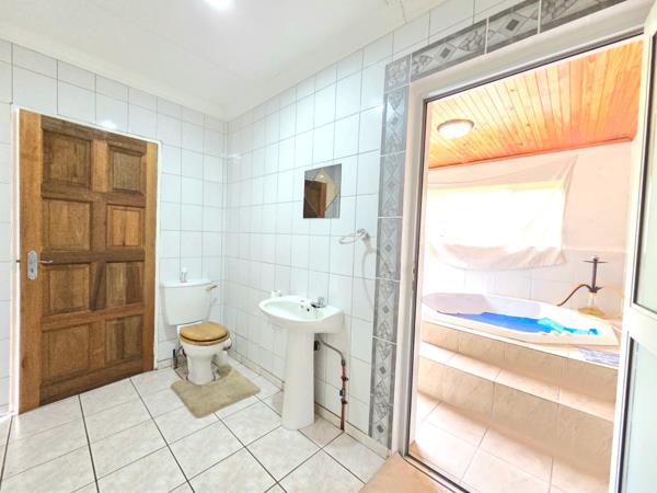 The main house features four spacious bedrooms, each fitted with built-in cupboards for ample storage. Two bathrooms, including a main en-suite, provide privacy and comfort. The large, well-appointed kitchen boasts a separate scullery, ideal for meal prep and organization. Entertain guests in the generous TV room and elegant dining area. Spacious entertainment area, complete with a built-in braai and bar, perfect for hosting gatherings. Relax and unwind in the Jacuzzi, which includes its own toilet and basin for added convenience. The property also offers two garages and ample storage space, with extra room that can be utilized as additional garages or storage solutions. A borehole supplies water solely for the garden, ensuring lush outdoor spaces, while a separate laundry room with a toilet and shower adds practicality.