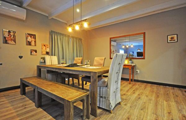 Large open-plan living area with dining space opening onto a covered patio and garden perfect for pets