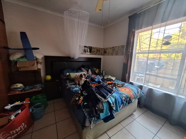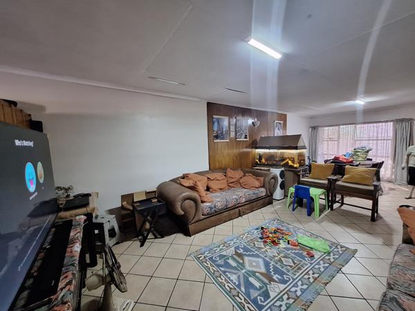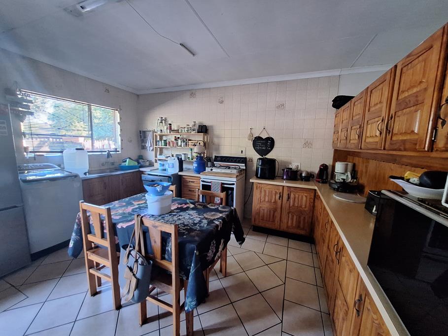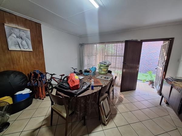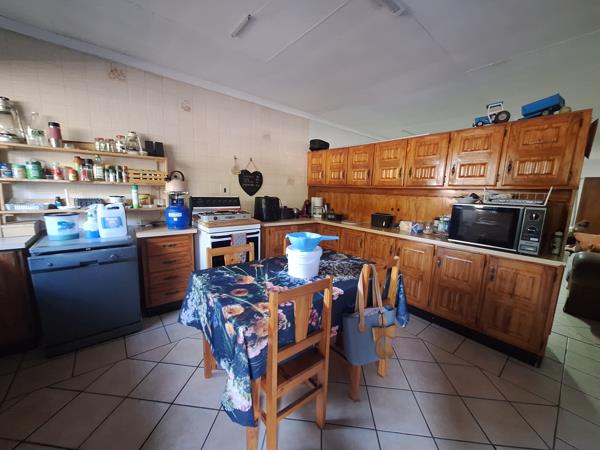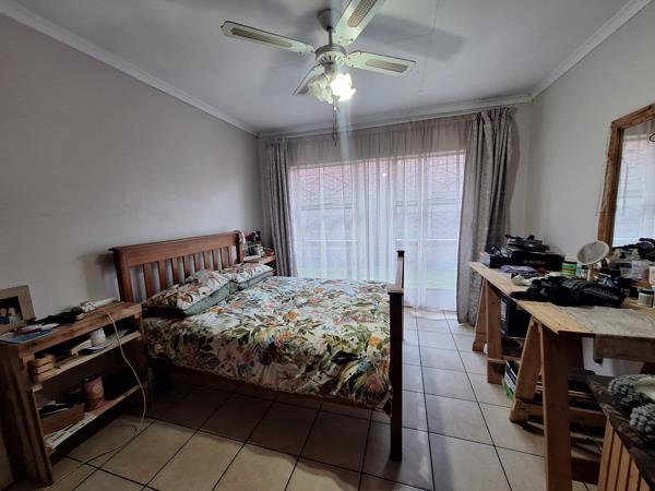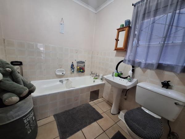The kitchen provides ample cupboard space. The property also includes a small garden, a lock-up garage, and an additional open parking space.