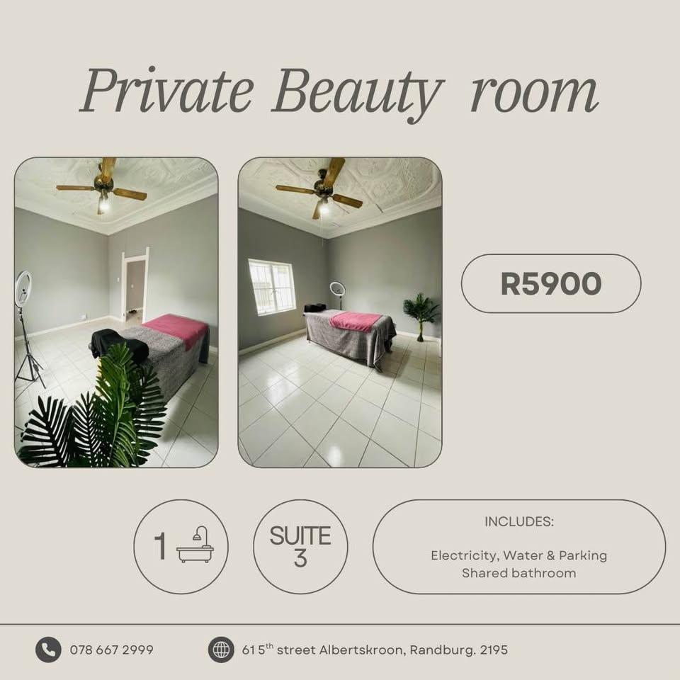 2 Spacious private beauty rooms available to rent in a busy, high-traffic area in Albertskroon, Randburg &ndash just minutes from Northcliff Corner Shopping Centre. Perfect for a nail technician, hairdresser, massage therapist, lash or brow artist, waxing or facial therapist, or makeup artist who wants independence and flexibility. This unfurnished room gives you the freedom to run your business your way, on your schedule. Please note: an existing client base is essential.