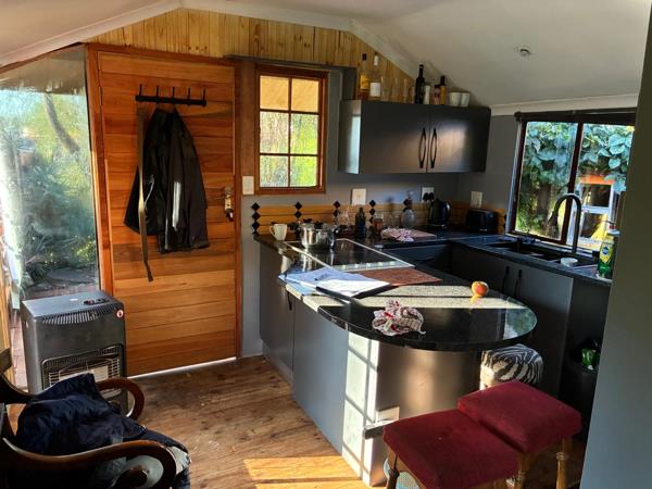This cottage boasts an open-plan kitchen and bedroom, and an en-suite shower with a basin and toilet.