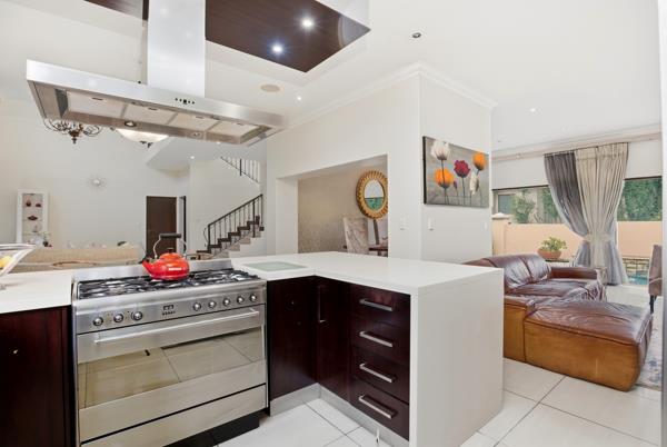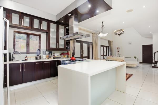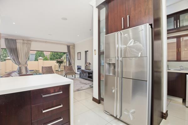 The ground floor showcases elegant open-plan living, with a modern designer kitchen, separate scullery (space for three appliances), and seamless flow through to the dining and lounge areas. The living space opens onto a private entertainment patio overlooking a sparkling pool, ideal for hosting or unwinding in peace.