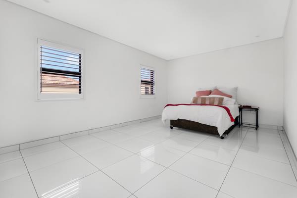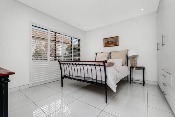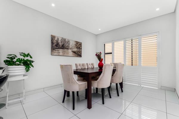 Boasting sleek white tiles throughout and elegant American shutters, the property exudes a sense of sophistication and light-filled space. It features three generously sized bedrooms and a cosy pyjama lounge, ideal for relaxed evenings. The open-plan kitchen has space for a double-door refrigerator and two wet undercounter appliances, is fibre ready, and flows seamlessly into the dining room and lounge, creating a perfect environment for both entertaining and everyday living.