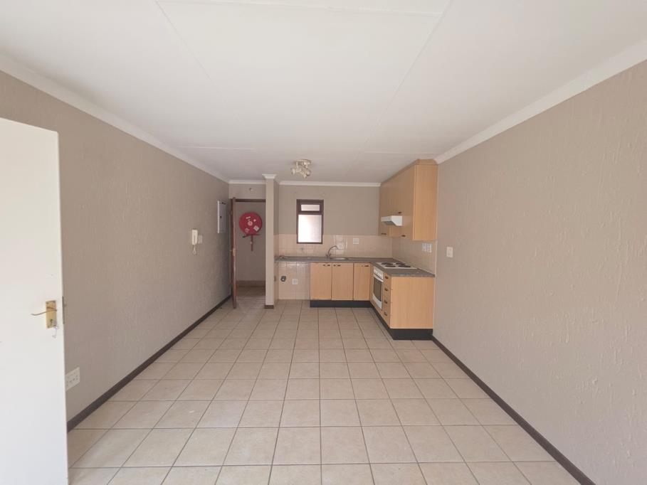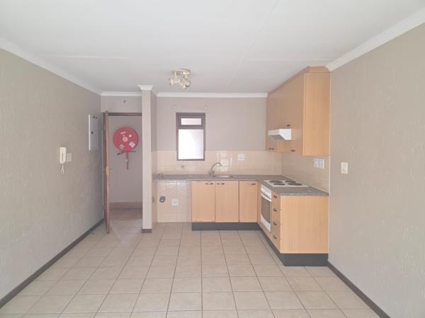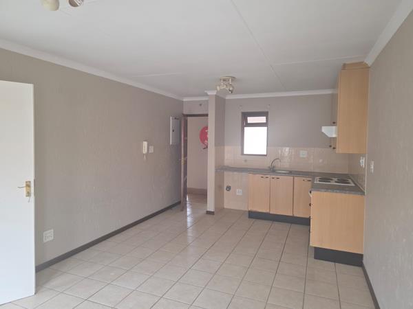 The open-plan kitchen flows seamlessly into the lounge, creating a versatile living space perfect for relaxing or entertaining. The kitchen is well-equipped with ample cupboard space, room for one under-counter appliance, and space for a single-door fridge.
