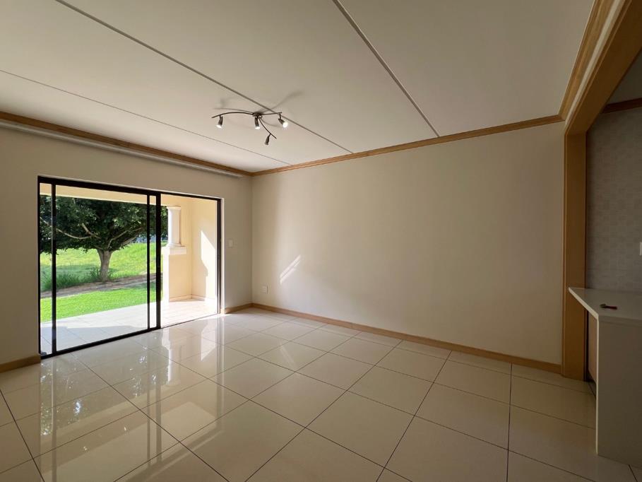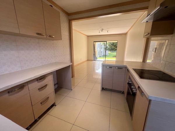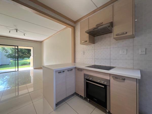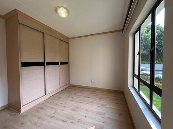 Large sliding glass doors in the living space provide abundant natural light and lead out to a tiled patio, featuring architectural pillars. This outdoor area offers a scenic view of the well-maintained communal garden with mature trees and paved pathways, perfect for relaxation. Residents benefit from access to a communal swimming pool, kids play park, a clubhouse, and a communal braai area, fostering a vibrant community lifestyle. The bedrooms are bright and feature modern wood-look laminate flooring and spacious built-in wardrobes with sliding doors, as seen in the photos, providing ample storage.
