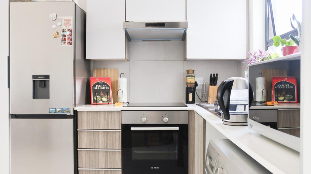 The open-plan layout features a modern kitchen (with appliances), a bright living area, and a bedroom with built-in cupboards. The bathroom includes both a bath and a shower.