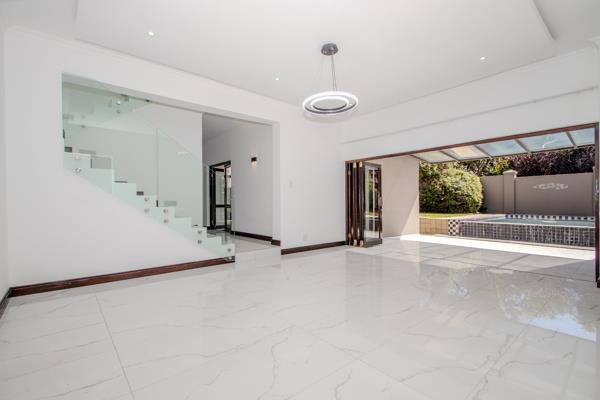 Downstairs is a seamless flow of living, family and entertaining areas. Stacking doors from the lounge/dining room as well as the bar and indoor braai area lead out onto the patio that overlooks the pool and garden. The living areas are all north facing and enjoy lovely views of the garden and pool. The patio is fitted with blinds which when closed provide protection from the weather when needed.