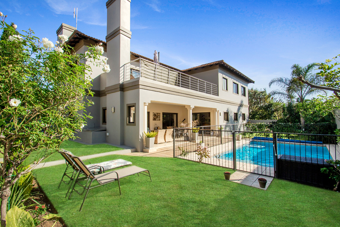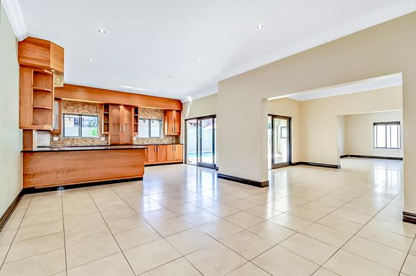 Living spaces are expansive and well-planned, featuring an open-plan layout that includes a formal lounge, a dining area, and an additional informal lounge all flowing effortlessly onto a covered patio that overlooks a manicured garden and a generously sized pool. This seamless indoor-outdoor integration makes the home ideal for entertaining or relaxed family living.