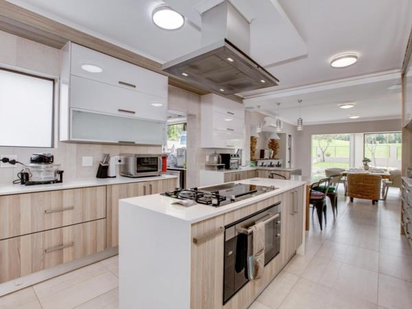 4 Bedrooms and 4 bathrooms, this modern home is perfectly positioned on the fairway. The kitchen, with its white, wooden, and stainless-steel finishes, has all of the modern conveniences that a family needs, fitted with Siemens appliances, a coffee machine, and a good-sized scullery. Elegant north-facing reception rooms portray a sense of balance with frameless glass stacking doors and panoramic views of the fairway flowing to the landscaped garden, sparkling pool, and fire pit.