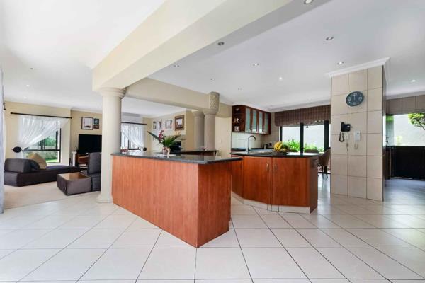 The double volume entrance hall with magnificent chandelier, welcomes you, both the lounge and family room have fireplaces for those cosy Winter evenings. Large open plan eat-in kitchen is a focal point in the living area, with solid cherrywood cupboards, granite tops, centre island, with a good-sized separate scullery. Both the lounge and family room open onto the central covered patio with built-in braai with views of the lush garden and sparkling pool.