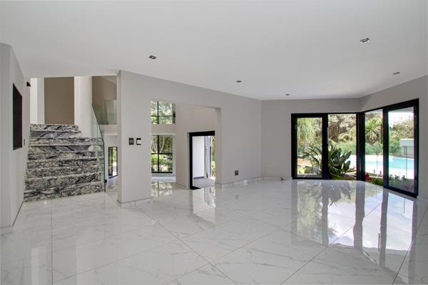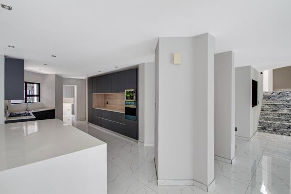 Tailored for modern living, the residence features free-flowing, fluid spaces that seamlessly integrate indoor and outdoor environments. Expansive glass windows flood the interiors with natural light, enhancing the sense of openness. The impressive double-volume entrance hall leads to elegant, interconnected reception areas, including a formal lounge and dining room. These sophisticated spaces cater to both formal and informal entertaining, balancing contemporary style with the comforts of family living.
