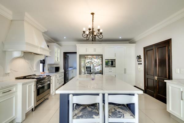 The modern kitchen, complete with a scullery and walk-in pantry, flows seamlessly into the dining room and two lounges, all opening onto a spacious entertainment patio overlooking the sparkling pool and beautifully manicured garden. A separate entertainment and games room, accessible directly from the garden, adds a unique touch perfect for hosting or relaxing with family and friends.