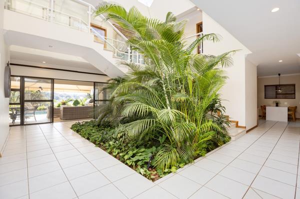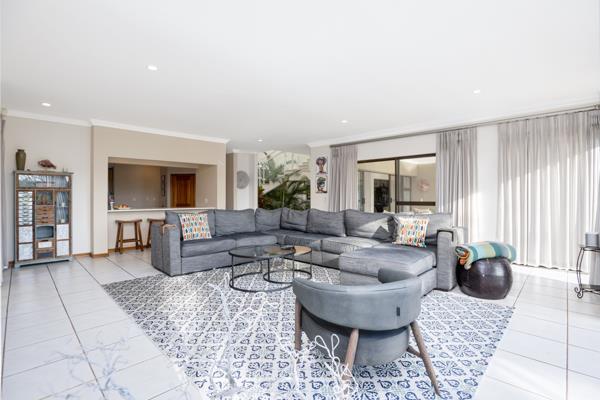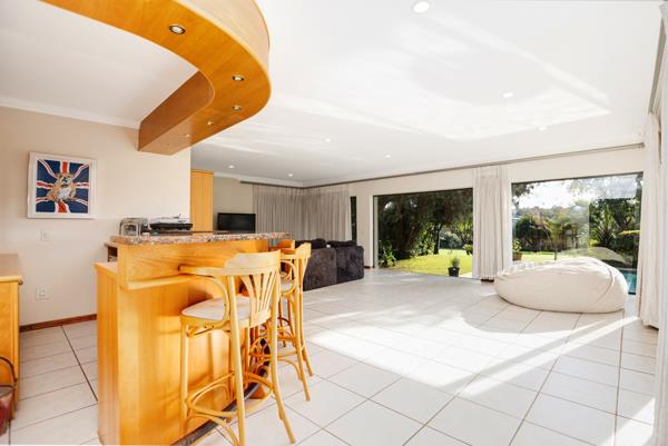 Entering into a double volume foyer with atrium and sky light, the interior flows easily to the generous sized entertainment areas and patio. A formal lounge include a fitted light-wood cocktail bar and flows onto the exterior spaces. Spacious formal dining room. Family lounge with serving hatch onto the superb kitchen. The eat-in kitchen is the heart of the home with caesar stone tops, gas hob, eye-level oven and stylish wooden cupboards for storage. Separate scullery with and laundry room with space for 3 appliances.