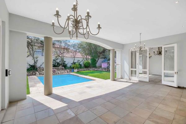 The downstairs floor plan is complete by having a brick wine cellar and a guest en-suite bedroom opening out into a private garden area. Upstairs are 4 large bedrooms, 3 bathrooms - 2 en-suite. So there is ample accommodation for a large family. The main bedroom has a walk-thru dressing room and stunning bathroom and private balcony. Outside there is a expansive covered patio with built-in braai. The patio flows from inside the house to outside and is spacious enough to be furnished with both patio and comfy sitting furniture, and overlooks the sparkling pool and mature, established private garden.