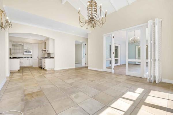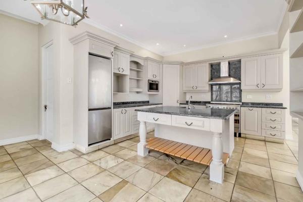 Natural light welcomes you as you enter this family home. The impressive double volume entrance has views of both the established garden and pool area. There are 4 reception rooms in total, all with doors opening into different garden areas and the covered patio. The spacious formal lounge has a gas fireplace for those chilly winter evenings there is a study, playroom and an open plan dining room or TV room with high ceiling and exposed beams. The open plan country kitchen boasts a centre island, granite tops, large gas oven and hob and plenty of cupboard space. The separate scullery is where all the appliances go there is space for 3 under-counter appliances.